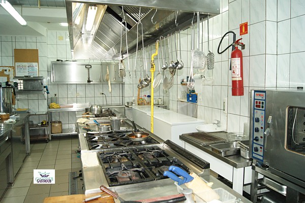 Der Küchenbereich mit ausreichender Kühltechnik und Gasherden ist professionell ausgestattet und bietet auch einem großen Küchenteam genug Raum bei kurzen Wegen. Das Restaurant ist Teil eines Hotelbetriebes und bereitet gegen Rechnungsstellung für die Hotelgäste das morgendliche Frühstück